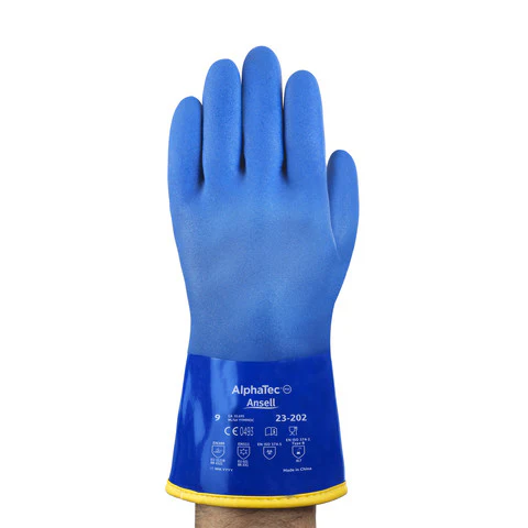 - Enhanced grip: Combining a rough sandblast finish around the hand and a smooth finish on the cuff, AlphaTec® 23-202 PVC-coated gloves ensure secure grip over wet or slippery objects and moderate chemical resistance